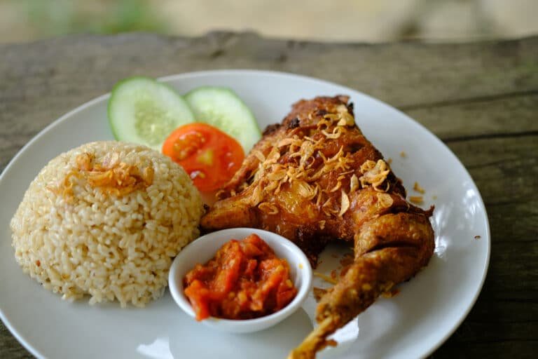 Le Ayam Bakar est généralement servi avec du riz blanc, des légumes sautés ou une salade de concombre, et accompagné d’une sauce pimentée (sambal) pour ceux qui aiment relever le plat.