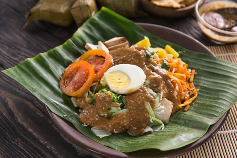 Le Gado-Gado est un plat traditionnel indonésien, souvent considéré comme une salade. C’est un mélange coloré et savoureux de légumes variés, comme des pousses de soja, des épinards, des pommes de terre, des haricots verts et du chou. Des éléments plus consistants, tels que du tofu, du tempeh (pâte de soja fermentée) et des œufs durs, sont également inclus pour ajouter des protéines.