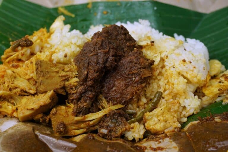 Le rendang est un plat traditionnel indonésien originaire des Minangkabau de Sumatra occidental. C’est un ragoût à base de viande, généralement du bœuf, qui est lentement mijoté dans une mixture riche de lait de coco et un mélange complexe d’épices, incluant le gingembre, la citronnelle, le galanga, les piments et la feuille de kaffir.